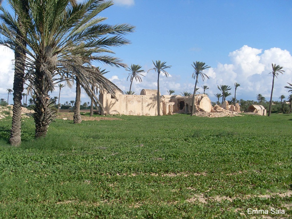 mais ce que j’ai toujours préféré à Djerba ce sont les balades dans la campagne… D’accord, cela exclut les heures chaudes de la journée mais c’est sans cesse une découverte renouvelée. Il suffit d’emprunter un chemin de terre … j’allais dire n’importe lequel et c’est un peu vrai… suivez ces « tabia » coiffées d’aloès et de cactus et au gré de vos pas vous découvrirez la vraie nature agricole de Djerba, tout un monde qui tend à disparaître : il y a d’ abord les immenses puits qui alimentaient les jardins , là on tombe sur un houch quelque peu en ruines, là sur une petite maison et sa citerne attenante, plus loin paissent quelques moutons , on reconnait aussi l’architecture triangulaire d’un atelier de tissage et lorsque l’on croise quelqu’un un « salamalekom » sonore et amical sera le bienvenu dans cet espace de silence et de paix.